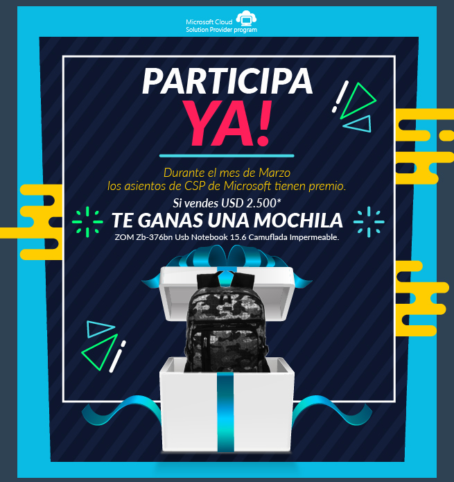 | Bases y condiciones: Válido desde el 1 de febrero hasta el 29 de marzo. Aplica a todos los productos de Microsoft en modalidad CSP. Cliente final nuevo segmento SMB corporativo. Se entregará un premio por canal una vez finalizado el Q (29 de marzo). Válido para República Argentina. *Valores expresados en dólares, IVA no incluido. *La imagen de la mochila es a modo de ejemplo. |